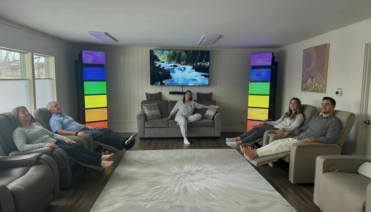 The Light System™ uses opposing screens that emit photons—tiny packets of light—that collide in the space between them, a process called photonic collision. This interaction strengthens and balances the energy field, enhancing the way energy flows through and around the body.