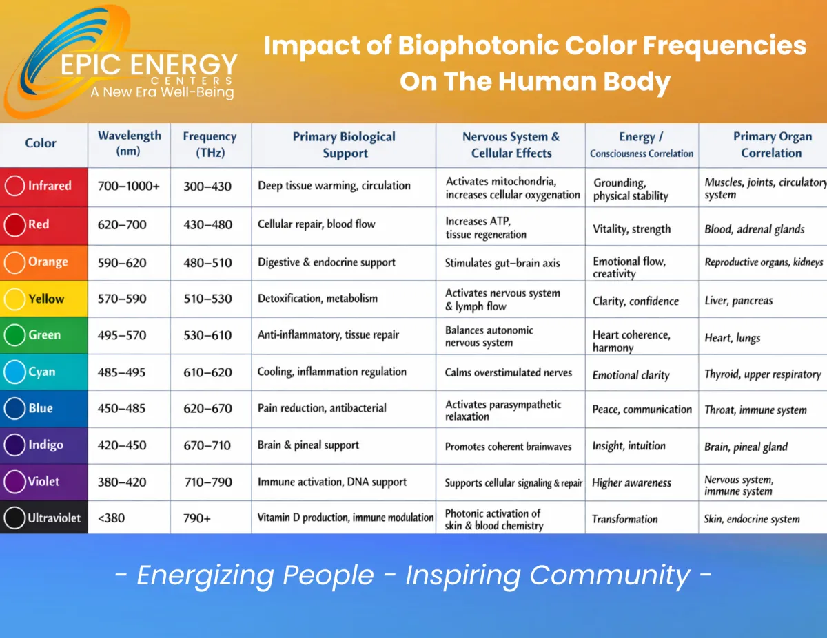 The Light System™ makes extensive use of color therapy, which has been studied for its effects on specific organs, systems, and emotional states. Different colors are associated with different potential benefits, and those frequencies are woven into the programs you receive.